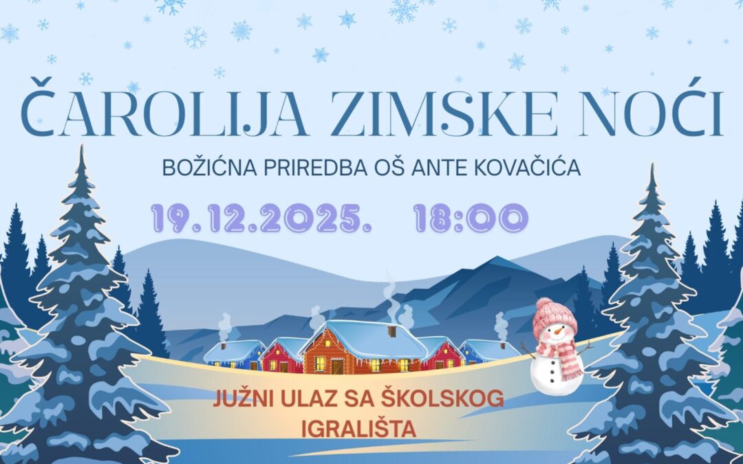 s veseljem vas pozivamo na svečanu Božićnu priredbu koja će se održati 19. prosinca 2025. u novoj dvorani OŠ Ante Kovačića s početkom u 18 sati.