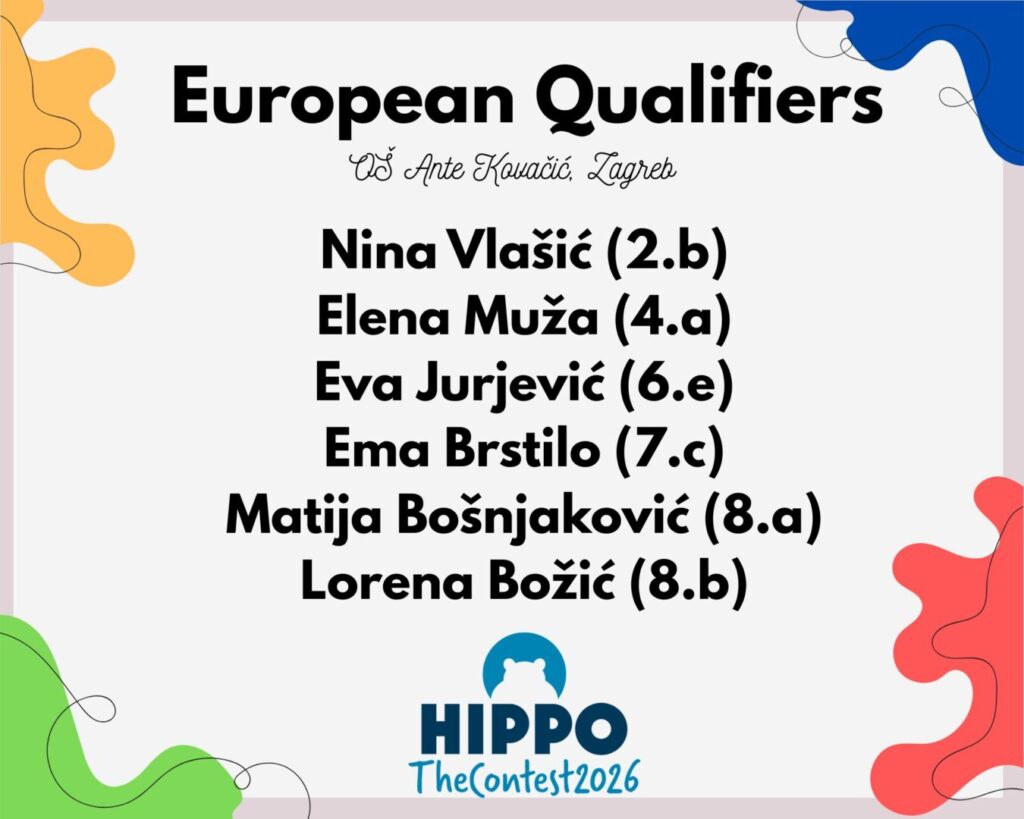 Drugi krug Hippo natjecanja (državno finale) u našoj školi održano je 24. travnja 2026. Čak 18 učenika rješavalo je online test čitanja s razumijevanjem, poznavanja gramatičkih struktura i pisanja. Nažalost, usred natjecanja škola je evakuirana zbog anonimne dojave o bombi. Uz dozvolu organizatora, učenici su testove hrabro dovršili putem mobilnih uređaja na Trgu Ivana Kukuljevića.