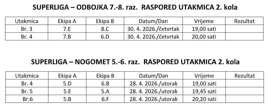 U odbojci (7.–8. razredi) na rasporedu su dvije utakmice u četvrtak, 30. travnja 2026. Snage će odmjeriti ekipe 7.E i 8.C u 19:00 sati, dok će u 20:00 sati igrati 7.B protiv 6.D.