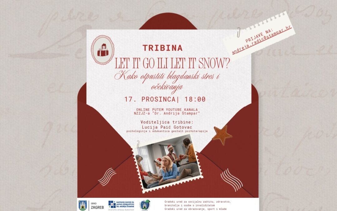 veliko nam je zadovoljstvo obavijestiti vas o novoj Tribini Let it go ili Let it snow? Kako otpustiti blagdanski stres i očekivanja?, koja će se održati u srijedu, 17. prosinca 2025. godine, s početkom u 18 sati putem YouTube kanala. Vodit će je mag. psych. i edukantica gestalt psihoterapije, Lucija Paić Gotovac iz Službe za mentalno zdravlje i prevenciju ovisnosti NZJZ „Dr. Andrija Štampar“.
