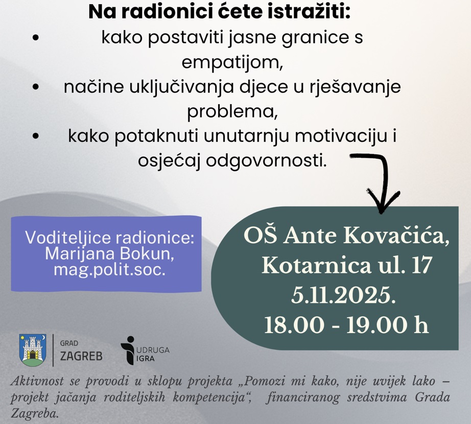 pozivamo vas da se prijavite na radionicu koja će se održati 5.11.2025. u 18:00 sati u Osnovnoj školi Ante Kovačića, Kotarnica ul. 17, 10 000 Zagreb. Pozivamo roditelje da se upoznaju s pristupom koji potiče odgovornost i suradnju kod djece, bez straha i prijetnji. Radionica se fokusira na: